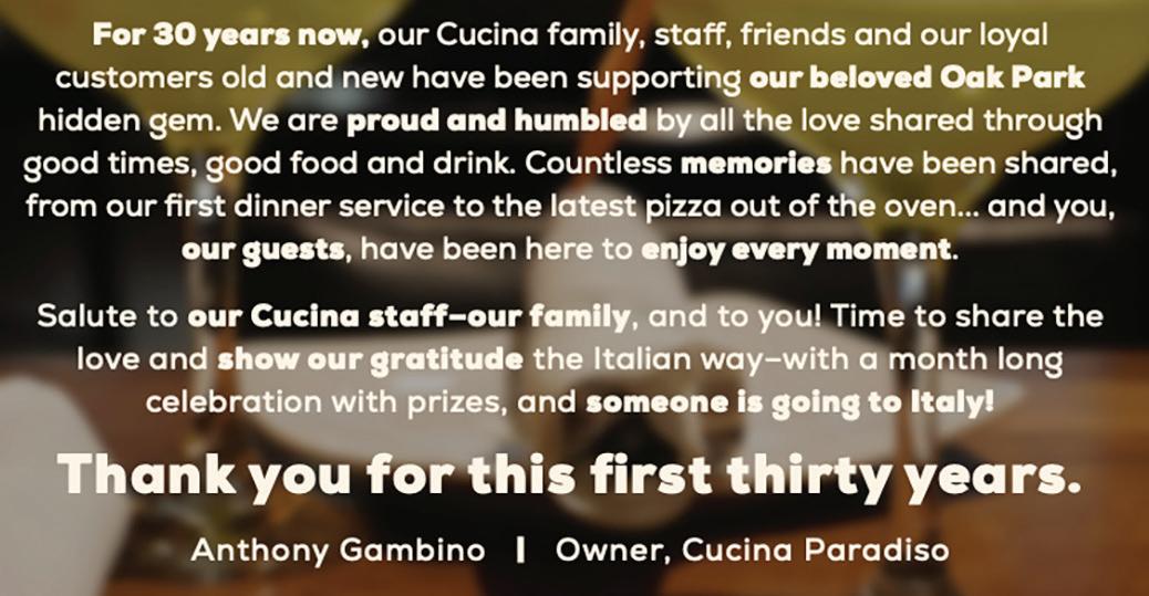 Cucina Paradiso .................... . 28 814 North Blvd, Oak Park (708) 848-3434 cucinaoakpark.com