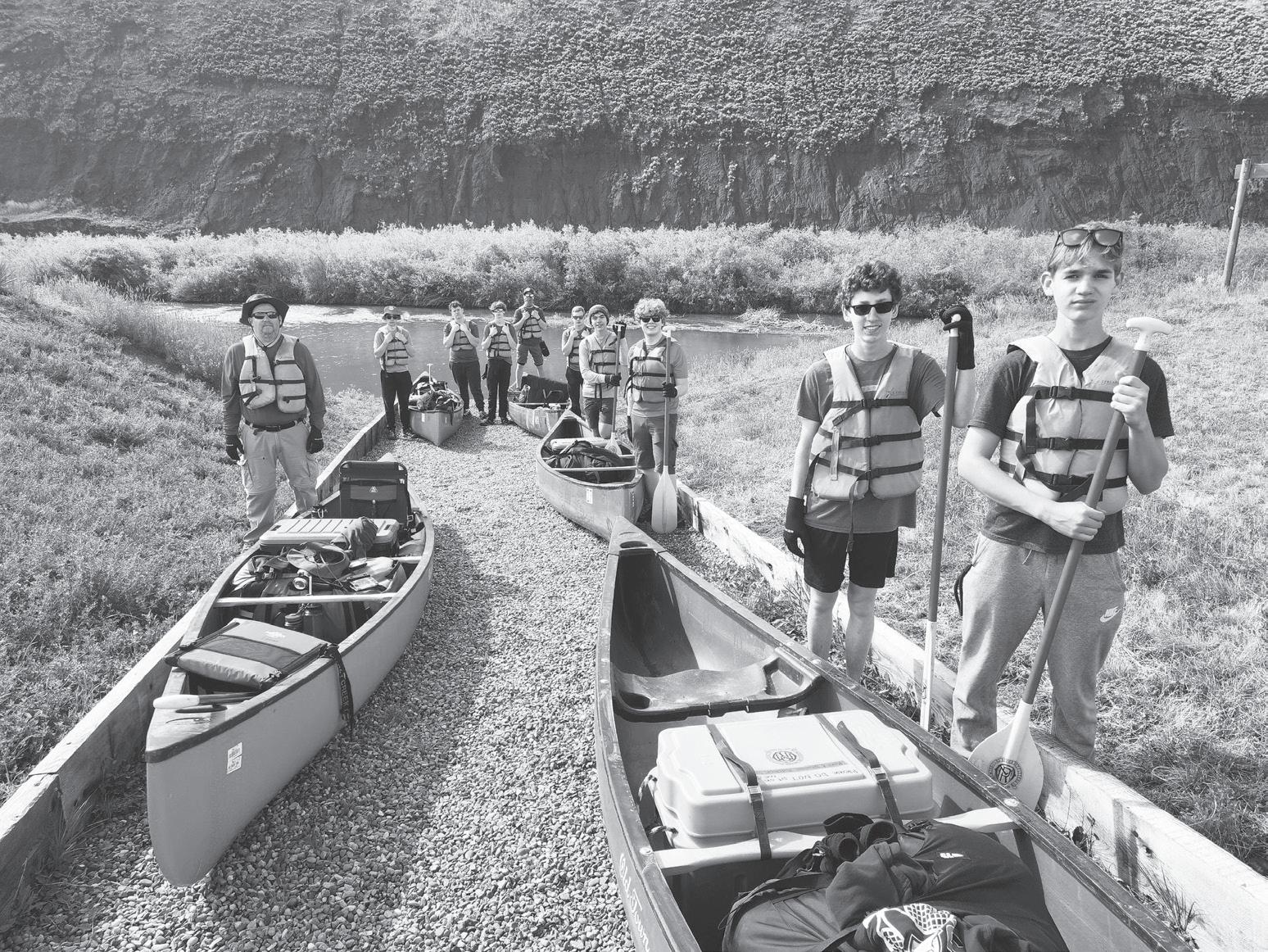 T hey traveled in two groups split up by ages: one for scouts aged 15-16 and one for 17-18. Every day after canoeing the scouts set up camp at a different site. T hey also explored the re gion with hikes; one mor ning the scouts woke up at 4 a.m. and hiked for an hour to watch the sun rise across the river valley