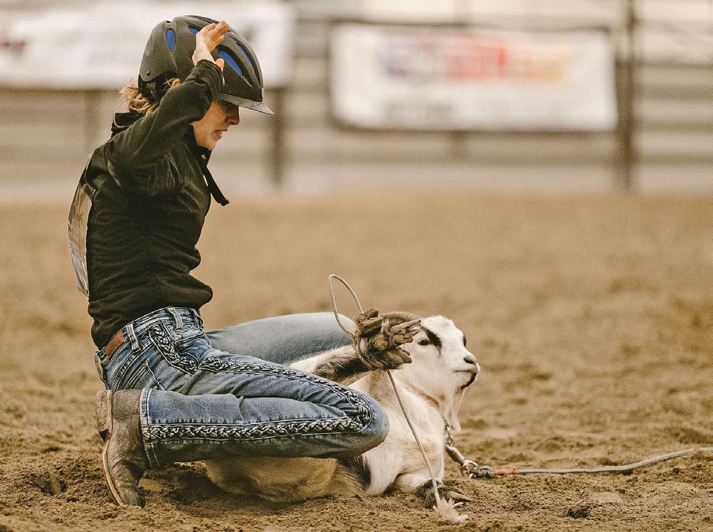 Goat tying: competitors dismount their horse when it is still running or sliding to a stop. They must flip the staked out goat on its side and tie together three of its legs, then signal with hands to indicate they have completed the run. The event is timed, and the goat must stay tied for six seconds or more.