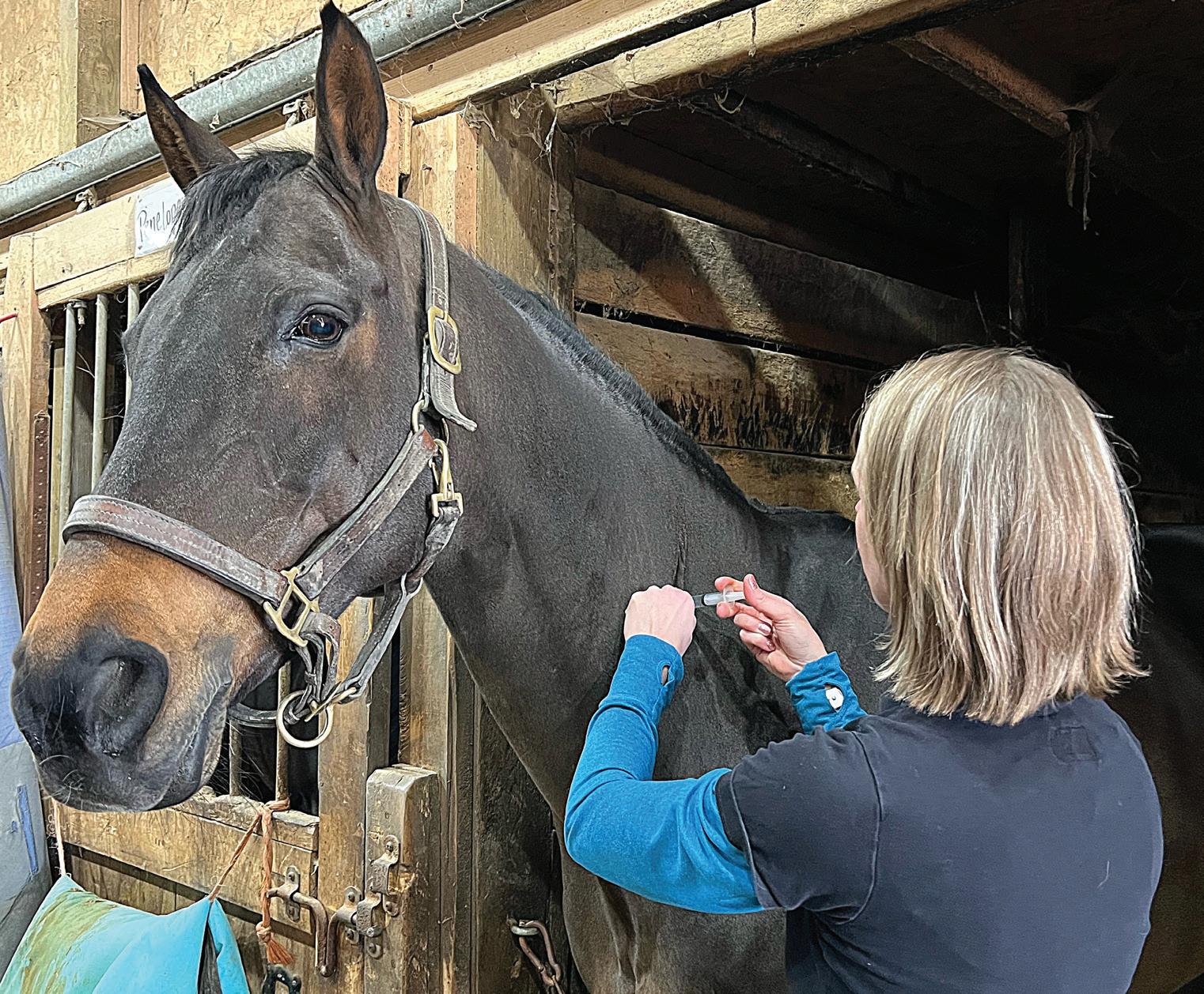 Here, Webster Aria, a warmblood mare from a barn in Moorefield, is vaccinated against tetanus, West Nile Virus, Equine encephalitis, rhinopneumonitis and influenza. Aria got her rabies vaccine in the fall. Submitted photo