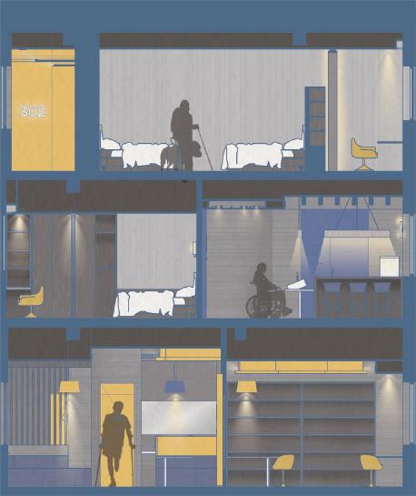 作品名稱|共感 作品簡介|學生宿舍將不同成長背景或文化的人們,同住在一個屋簷下,擁有共同的回 憶與感受,建立起更緊密的人際關係。藉由動線規劃、地坪及家具設計,讓視覺及肢 體障礙者、一般使用者皆能在舒適地使用空間的情境下互相交流、創造回憶。 2022 海南自貿港艾迪獎 高校組銅獎