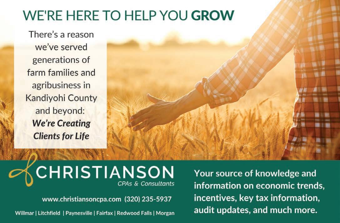 8 – West Central Tribune – March 2024 The Dryer Doctors can help with all your grain handling needs. 7039 Highway 7 SW, Montevideo, MN 56265 Business Hours: Monday - Friday: 8:00 - 5:00 thedryerdoctors.com thedryerdoctors@gmail.com • (320) 321-1600 Specializing in GSI & FFI Grain Dryers Willmar Aerial Spraying, Inc. Olivia Airport, Olivia, MN 56277 320-523-2186 Richard Sigurdson Your source for Quality Farm Equipment, Parts, and Service. We specialize in Sugar Beet Equipment, Spring Tillage, Sprayers, Fall Tillage, and Grain Handling. Stop by today & visit with our staff. We look forward to seeing you! 18 Division St. S • Clara City, MN 56222 • Tel: 320-847-3218 • Fax: 320-847-2680