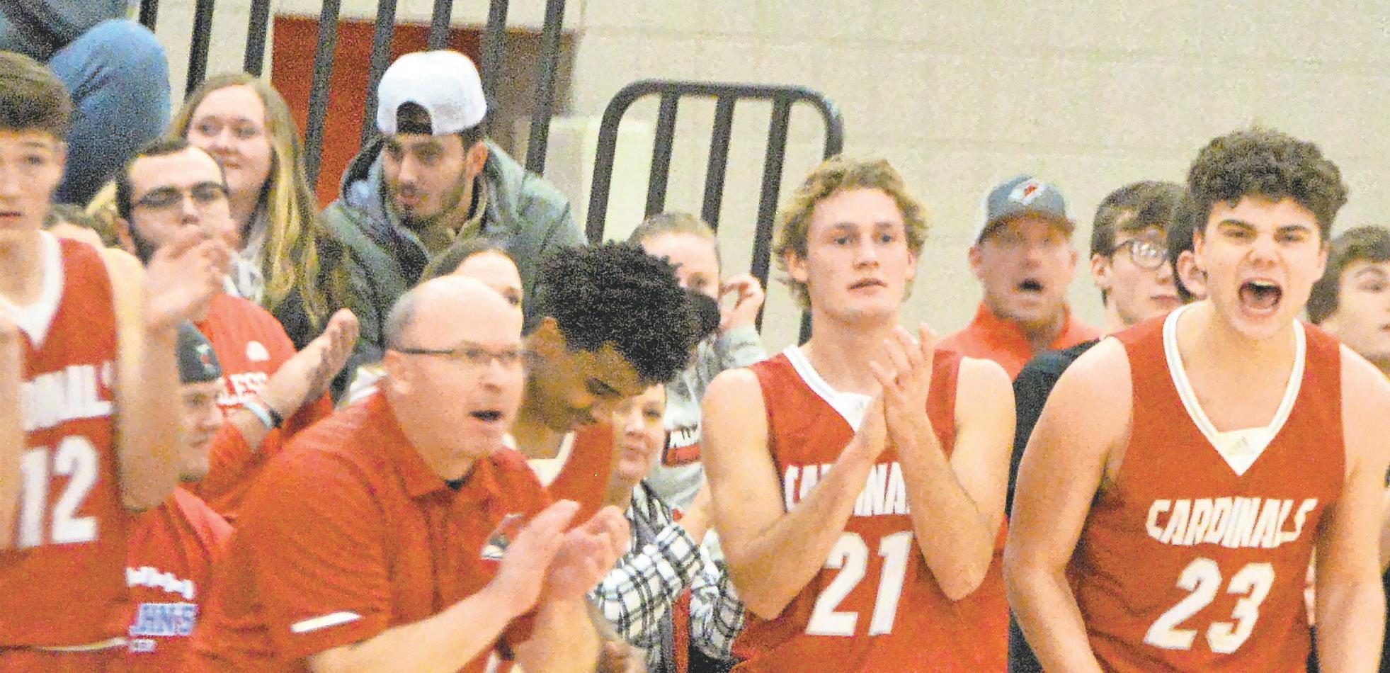 Willmar junior Blake Schoolmeester (23) celebrates with the Cardinals’ bench during the Cardinals’ late comeback run in the first half against NLS on Thursday, Dec. 30, 2021, in Willmar.