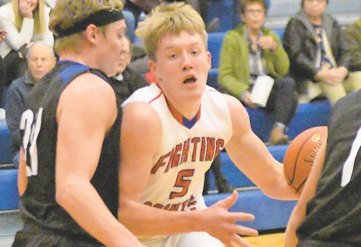 KMS junior Isaac Rudningen, right, attempts to push into the paint against CMCS senior Ben Van Eps on Thursday, Dec. 16, 2021, in Prinsburg.