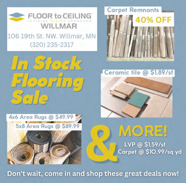 PRST STD U.S. POSTAGE PAID WILLMAR MN PERMIT NO. 17 PUBLISHED BY THE WEST CENTRAL TRIBUNE REACH 15,200 READERS WEEKLY! VOLUME 91 NO 30 SUNday, JULy 23, 2023 WILLMaR, MN 56201 JOIN OUR TEAM APPLY ONLINE TODAY! COMPETITIVE WAGES | PAID TIME OFF FULL BENEFITS | 401K dooleypetro.com/careers THE BEST BRANDS GUARANTEED LOWEST PRICES MATTRESS | FURNITURE | DECOR MATTRESS | FURNITURE | DECOR -orWe Will Give You $100 HOME | SLEEP | DÉCOR 56th Anniversary S A L E up to 56% OFF LIST PRICES in-store and online! NEW! 60% OFF! 59% OFF! 52% OFF! 57% OFF! sale $39999 sale $89899 sale $34999 ASHLEY REDMOND SOFA 90W 36D 38H SKU# 1200138 FINAL PRICE. NO FURTHER DISCOUNTS. BOSSA NOVA SOFA 79W 35D 36H SKU# QK1055745 DIEGO QUEEN BED 65W 89D 52H SKU# QK1013869 sale $39800 sale $39800 sale $49900 DANA POINT QUEEN BED 66W 85D 47H SKU# QK1017531 KING sale $648 SKU# QK1Q17534 VAIL ROCKER RECLINER 32W 36D 40.5H SKU# 4039073 CAMDEN 5 PIECE DINING SET 36W 47.75D 30H SKU# QK1044271 FINAL PRICE. NO FURTHER DISCOUNTS. On 1st St Across From Target (320)231-0450 FREE SHIPPING TO YOUR DOORSTEP IN OUR LOCAL DELIVERY AREA • $500 MINIMUM plus! ENTER FOR A CHANCE TO WIN A FREE CAR! SCAN QR CODE FOR DETAILS Hot BUYS! Hot BUYS! Hot BUYS! 100% solid wood! Pewter 58% OFF!