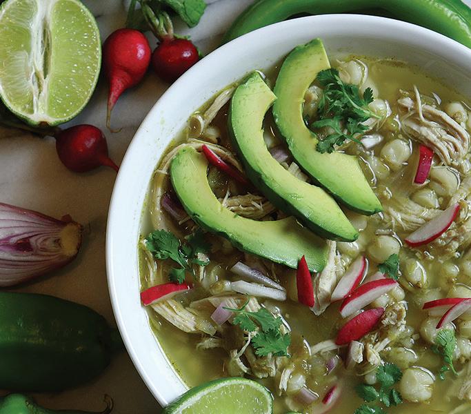 until soft and translucent. Add the peppers and garlic and saute for an additional minute, stirring occasionally. Add chicken stock, 2 cups water, cumin and salt, and bring to a simmer. If you’re not using pre-cooked chicken, add the raw chicken and cook for 15 minutes, or until cooked through. Remove and shred. Add the hominy. Return the chicken to the soup. Reduce heat to medium low and simmer for at least 5 minutes. Salt and pepper to taste. Serve hot with your desired garnishes.