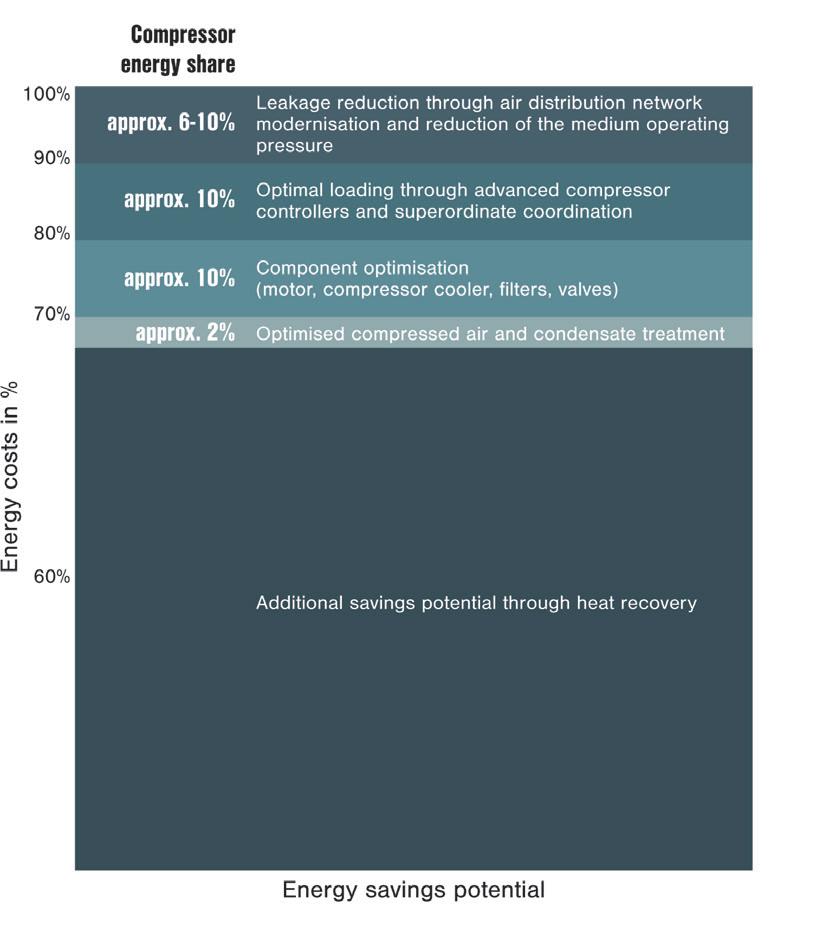 As a general rule, relatively high potential savings can be achieved through optimisation of compressed air systems. According to studies, savings ranging between 10 and 70% of energy costs can be achieved — regardless of the condition of the existing system (Figure 2).