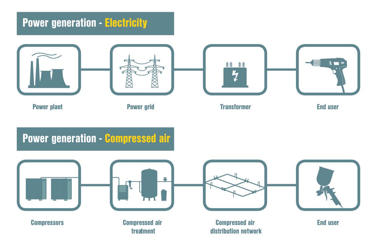 A compressed air system comprises more than just the station itself; it’s rather like a chain, as in the case of electricity generation. In relation to compressed air, the chain begins with compressed air production, followed by treatment and distribution, and ends with the compressed air user. The whole chain must work synergistically to achieve the most cost-effective compressed air supply (Figure 3).