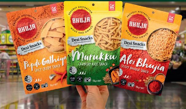Majans has introduced a range of South Asianstyle street snacks, ‘Desi Snacks’, at select Woolworths stores. The latest snacks in the Bhuja Desi Snacks range include: Aloo Bhuja noodle snacks, Murukku rice snack and Papdi Gathiya spicy plant protein snacks. majans.com.au