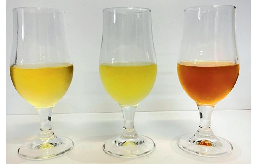 Kombucha (left) and kombucha-like beverages from passionfruit (centre) and apple (right) juices. Adapted
