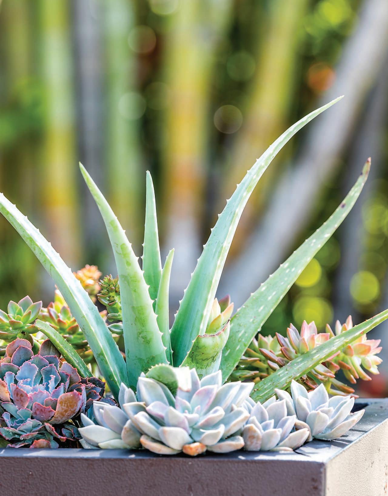 in pots or planted in the yard. “Succulents are always a choice for drought-tolerance, but they are typically not flowering,” says Elwell. “Contrast of texture and color of the plant can be beautiful without the blooms.”