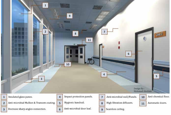 Healthcare systems have been overwhelmed by a high rate of hospitalisation and quarantine measures. In fact, there has been a shift in building design perspective particularly related to healthcare facilities. This necessitates reshaping the architecture and interior spaces to accommodate the new requirements dictated by the evolved regulations and standards post the pandemic. The pandemic has highlighted the importance of refining healthcare frameworks and proposing innovative tools to accommodate the rapid increase in patients. Therefore, it has become obvious that countries worldwide have to expand, upgrade, and retrofit existing healthcare facilities with an appropriate selection of façades and building design materials, such as cladding, flooring, and ceiling.
