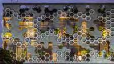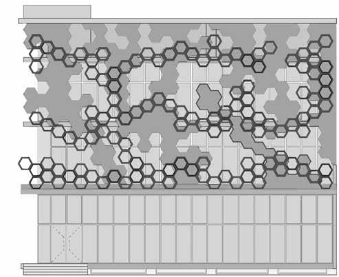 been used as a shading element. To better preserve the sanctity of shade, the screen flows organically creating an artistic visual dilemma from both inside as well as outside. Another layer of hexagonal silhouette made of metal frames is superimposed horizontally across the semi-