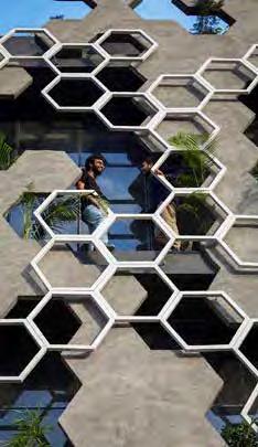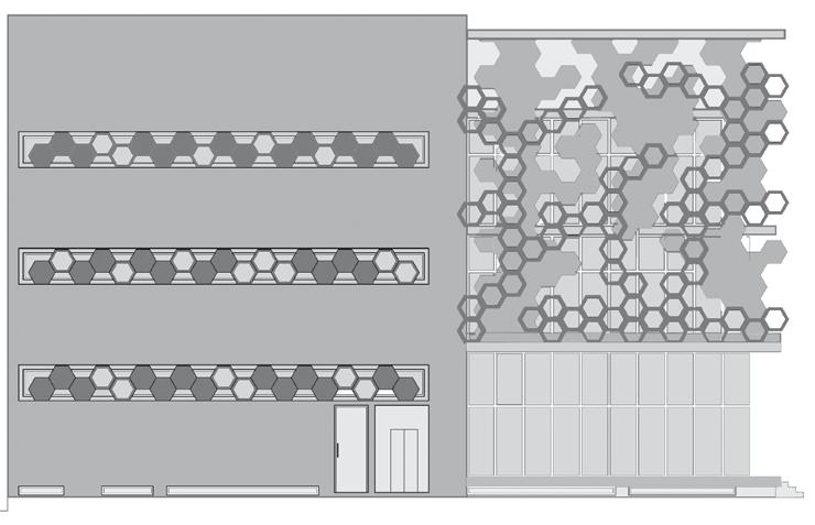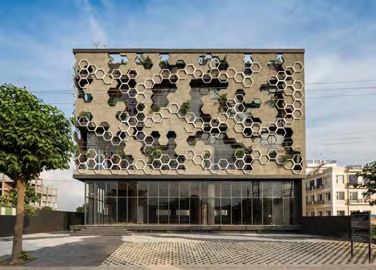 would have to be manifested from the façade. Considering the arduous climatic conditions involving extreme heat, and the building front facing west, the façade emerged as a buffer of stratifying elements. The 3-inches thick concrete layer with hexagonal interstices has