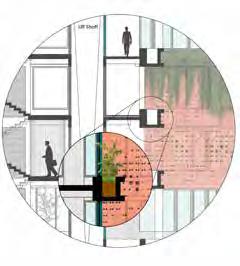 envelopes the core and provides shade from the harsh sunlight of the south and west throughout the day. The skin wraps around on the fifth and sixth floor to unify the structure and create an inviting and invigorating volume of the five-floor high entrance. The entrance is where the private world of the tower meets the public realm and this soaring light-filled space tones down the scale, making it look proportionate to the floor plate. The voluptuous space of the eight stories structure, transforms visibly into a fivestoried structure, a warmer, more approachable and composed space, therefore, justifying the use of the word ‘House ‘and departing from the overtly used word ‘corporate’.
