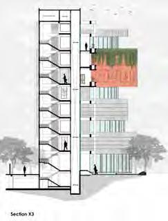exposed concrete walls that are structural. Bearing in mind the cantilever's scale, alternate floors have been intentionally connected with sheer walls; resulting in each floor acting as a single beam, with the functions shuffled accordingly. This exercise led to a column/wallfree alternate floor.