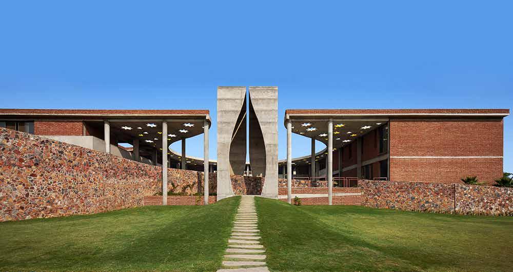 sandstone as the primary facade material. The east and northern faces have a continuous doubleglass unit (DGU) glazed facade to allow daylight into interior spaces while insulating them from heat. The eastern facade is thermally insulated with double walls built using ACC masonry with a glass wool infill of 200 mm thickness. The western facade covers the service cores and features solid walls and GFRC jaalis that allow creepers to grow on them and bring cooling breezes into the building for crossventilation.