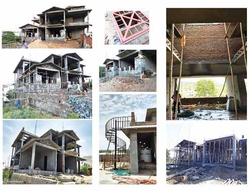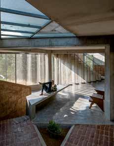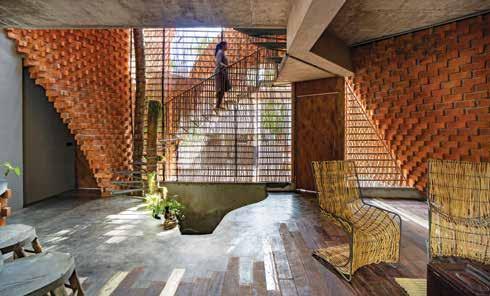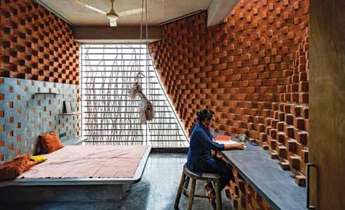 bond masonry’ technique in this site which didn’t offer the opportunity for soil excavation or for making mud blocks. Keeping in mind that brick kilns in Trivandrum is a dying industry with people opting out for wire-cut machine made bricks, this was also an attempt to promote this local agriculture-based industry that is on the brink of extinction. The ‘Rat trap bond’ is a brick masonry method of wall construction in which bricks are placed in vertical position instead of conventional horizontal position and thus creating a cavity within the wall that increases thermal efficiency, cuts down on the total volume of bricks used and is ideal for concealing structural members and service ducts. The idea was further