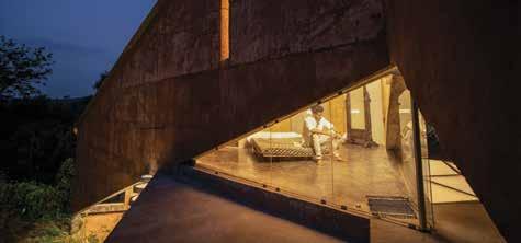 the materials procured from the land itself, this being a prerogative of Wallmakers as we exclusively indulge in sustainable building practices. The soil procured by excavating the rainwater harvesting tank and the basement floor however presented an opportunity in the guise of a problem. The rocky terrain soil was filled with pebbles and debris which was deemed unsuitable for making mud bricks. Therefore, the patented technique of Shuttered Debris Wall was used here. Thus the slanting waste material wall and a view to withhold was born. Since the major length of the building ran along the westside as a solid wall with small openings, lack of cross-ventilation posed a new problem. After foraging in the market the answer rose in the form of Aluminium coin sheets that were perforated to let in light and air. A rhythmic undulating pattern was worked out on it so that this facade doubled up to become the staircase and answer the security concerns.