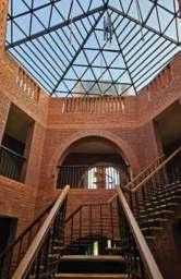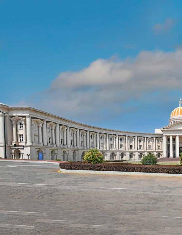 incorporates traditional features like jaalis and stepped wells while embracing modern principles. The exterior facade, emphasizing sustainability, mirrors temple ornamentation, and the ceiling patterns take cues from the art of rangoli, creating a harmonious blend of tradition and modernitythatepitomizesIndia’sessence.
