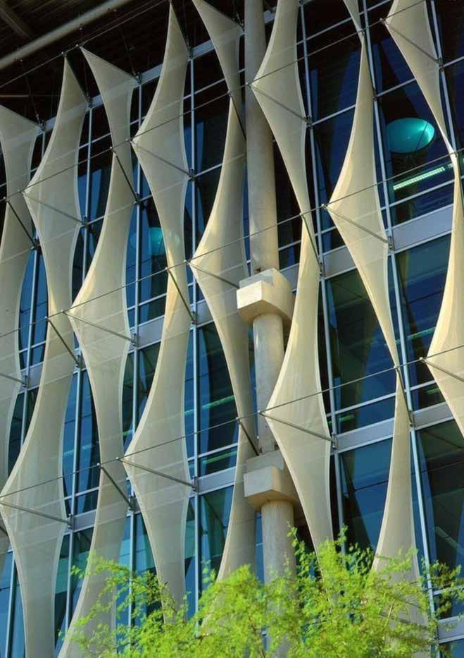 • Design Flexibility: Fabric façades offer limitless possibilities when it comes to design. The material’s flexibility allows architects to experiment with different shapes, forms, and patterns, giving each building a unique identity. Additionally, fabrics can be printed with custom graphics or branding, making them a