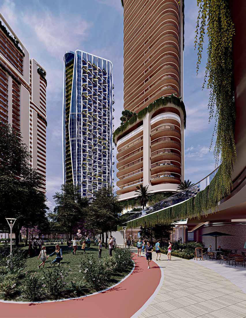 Certainly, I’d be happy to provide some details on the façades of some of my favorite projects: One of my favourite projects that we are currently working on at Studio3eight is the Green Diamond development. This is a prime location for a multiresidential, mixed-use project that has sustainability and amenity at the forefront of its design. Our team focused on incorporating biophilic design elements to create a natural buffer against noise, heat, wind, and to enhance privacy. The result is a community that is surrounded by dense vegetation, offering a pleasing and nature-inspired vista both inside and outside the building. It’s a project that showcases our commitment to creating sustainable and innovative designs that prioritise the well-being of both the environment and the community.