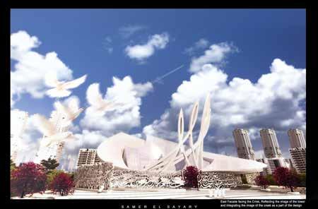 environment is a hallmark of Middle Eastern architecture and is something that I believe more architects should explore. One layer carries the indented words of God (Verses of the Quran). Another layer that reflects the surrounding urban landmarks is a direct interaction between the mass of the mosque and the city of Dubai.