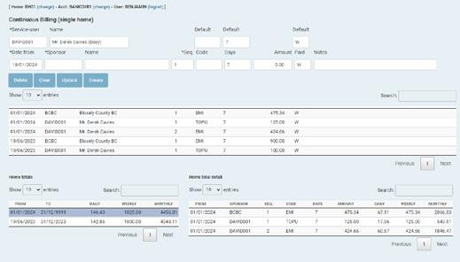 Separation of sponsor and service user responsibilities permits unlimited sponsor/service user relationships, and as any number of charge codes may be defined, this allows complete flexibility of service user/sponsor / charge code definition. Its unique continuous billing function is the most efficient means possible of defining recurring charges (an entry is