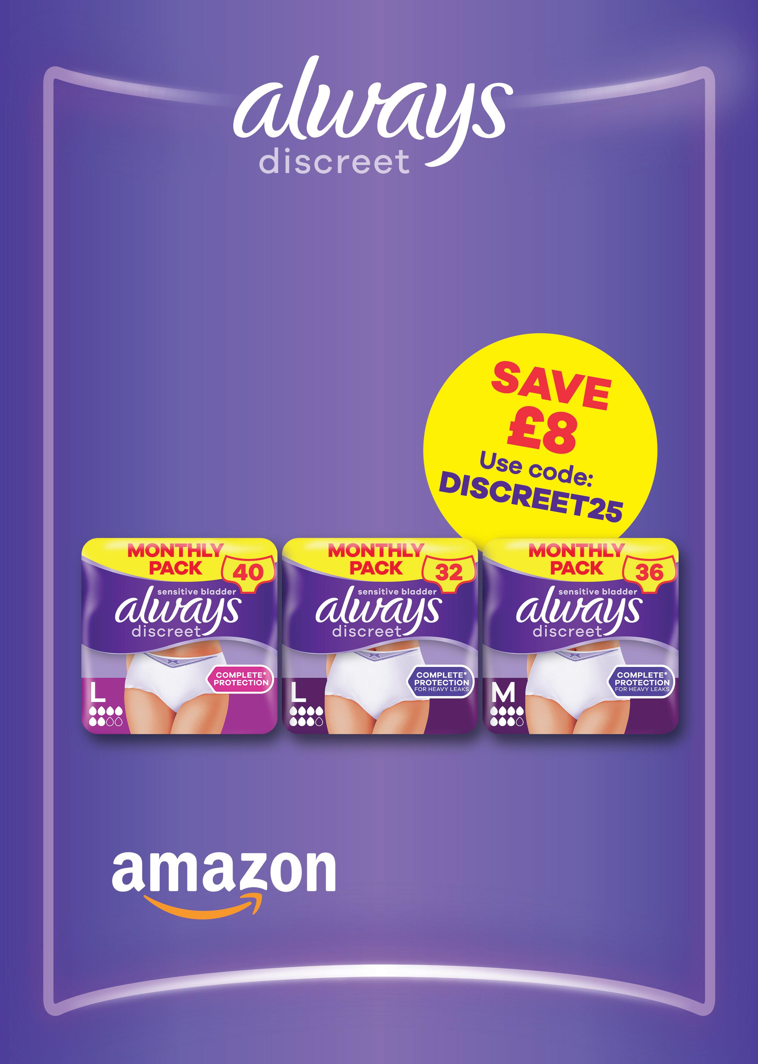 Coupon valid for Always Discreet Incontinence Pants Large, 40 underwear; Large, 32 underwear; Medium, 36 Underwear.