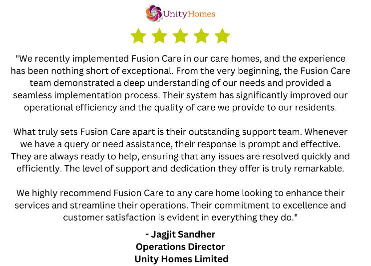 With a solution like Fusion Care, care homes can confidently embrace digital transformation, focusing on what truly matters—delivering exceptional care. Call us on 01133 979 555, email hello@fusioncare.co.uk or visit www.fusioncare.co.uk