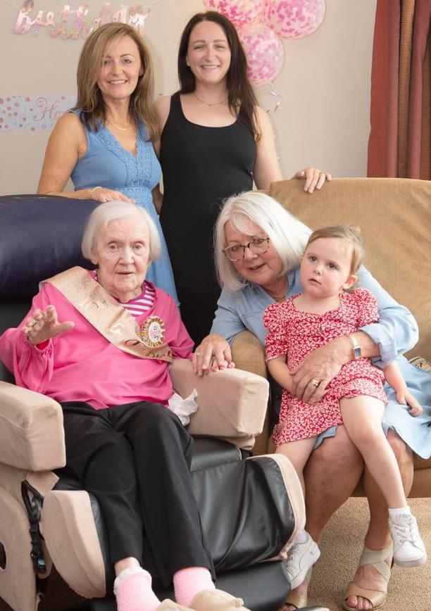 A much-loved Scottish woman has celebrated her 100th birthday in style surrounded by five generations of her family, including her greatgreat-grandchildren. Centenarian Elizabeth (Betty) Taylor, who was part of the Land Army during World War II, spent her milestone birthday at Meallmore’s Parklands Care Home in Alloa. To mark the milestone, Betty had a 100th birthday party with family and fellow residents at Parklands. The home’s activity coordinator, Corri Walker, decorated the main lounge with rose gold decorations and balloons, and provided Betty with a birthday sash and badge. Betty’s favourite singer, Engelbert Humperdinck, was played all afternoon whilst party food, cakes, and drinks were served.
