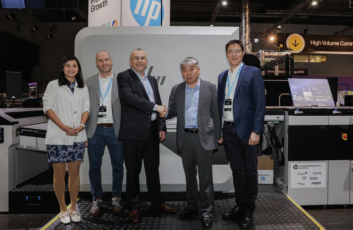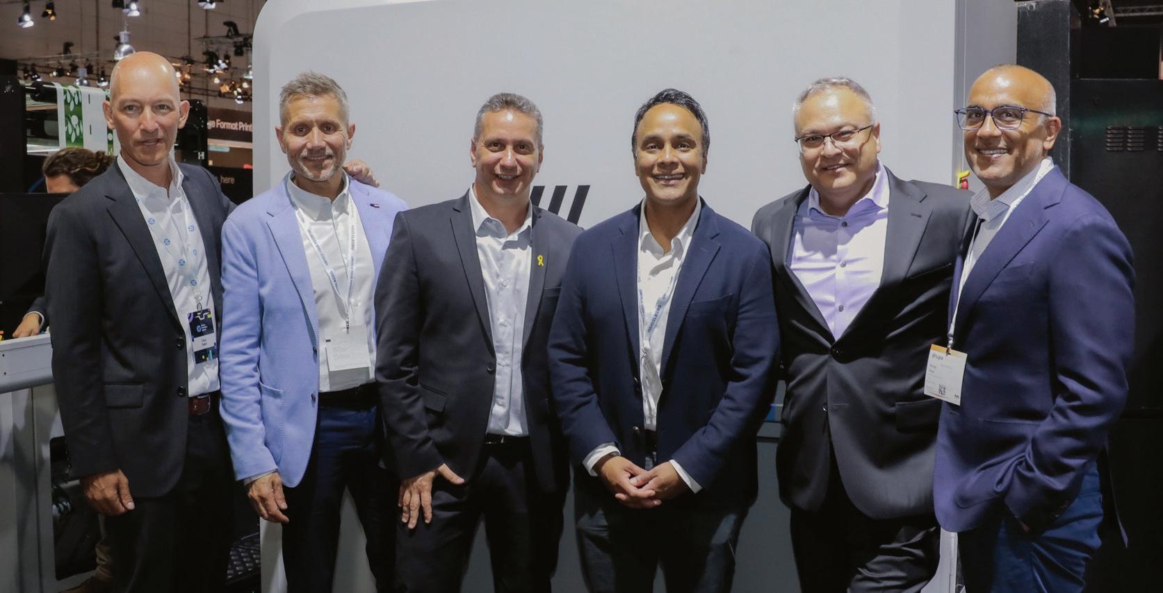 FROM LEFT: Oran Sokol, Global Head of Strategic Accounts, HP Inc.; John Peat, ePac COO; Noam Zilbershtain, VP & General Manager, HP Indigo & Scitex; Virag Patel, ePac CEO; Haim Levit, SVP & Division President, HP Industrial Print; Parag Patel, CRO.