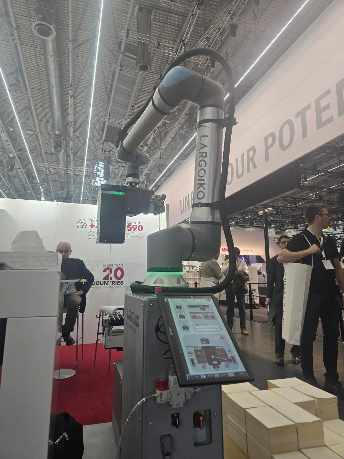 Im Rahmen der kommerziellen Demonstration transportiert ein autonomer mobiler Roboter (AMR) die gedruckten Bögen zu einem MBO-Falzapparat, der mit einem eigenen Roboter ausgestattet ist, der die gefalzten Bögen zum AMR transportiert. Der mobile Roboter transportiert die Signaturen dann über den Gang zur Komori-Tochter MBO Postpress Solutions, wo sie auf einem Hohner-Sammelhefter gebunden werden.