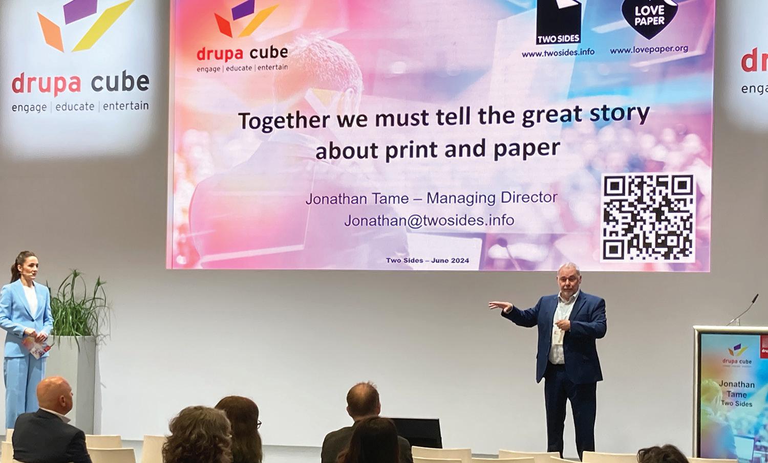 Jonathan Tame, Managing Director of Two Sides, presented a drupa cube session on June 1 entitled “Print, Paper and Paper Packaging - The Natural and Sustainable Choice“