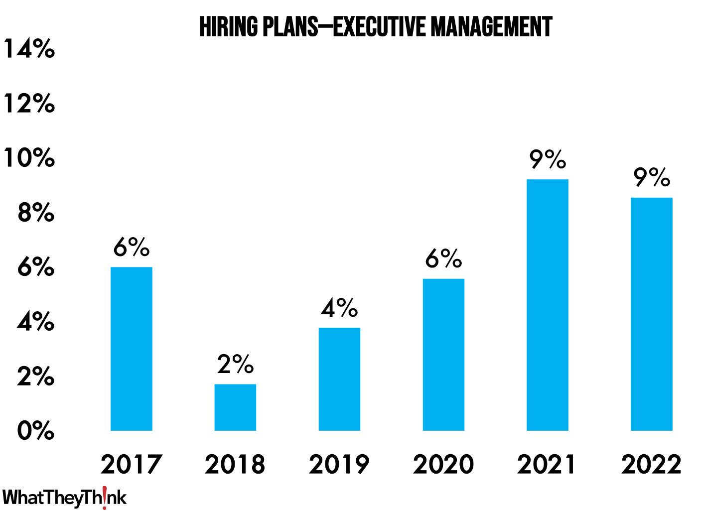 Another way of looking at this is via hiring plans. Here we show the percentage of print businesses that plan to hire staff in the next year, including executive management.