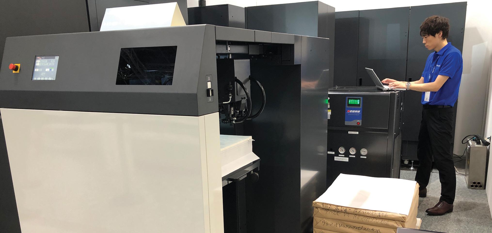 Anchoring the commercial zone was a Lithrone G37P advance EX Edition (GL-837P-A), a 37-in., eight-color convertible perfector with H-UV L (LED) curing. Komori said that the autonomously-running press can start itself and come up to color and registration in about 70 4/4 makeready sheets. During the run, AI assistance alerts the operator to printing issues and recommends corrective action.