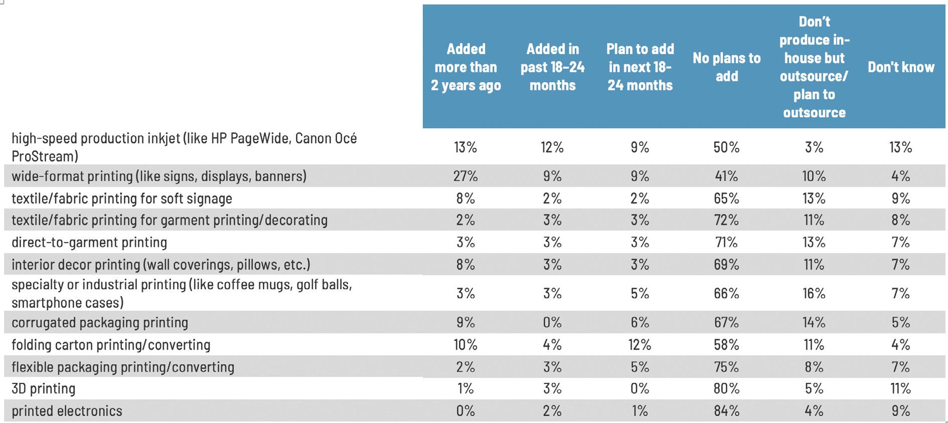 So where do print businesses see their growth areas? Production inkjet and folding carton printing (and the two are not mutually exclusive) appear to be the areas in which printers look to be expanding. Display graphics had been the hot application area 10 years ago, but everyone who was ever likely to get into display graphics has already done so. Textile and other specialty printing—especially décor—have been touted as hot growth areas, but they have not turned up in our survey data, or at least not yet.