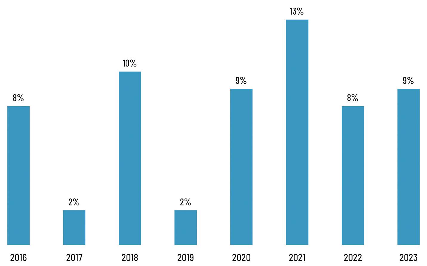 Figure 1: “Adding packaging capabilities” as a new business opportunity. Source: WhatTheyThink Print Business Outlook surveys, 2016–2023.