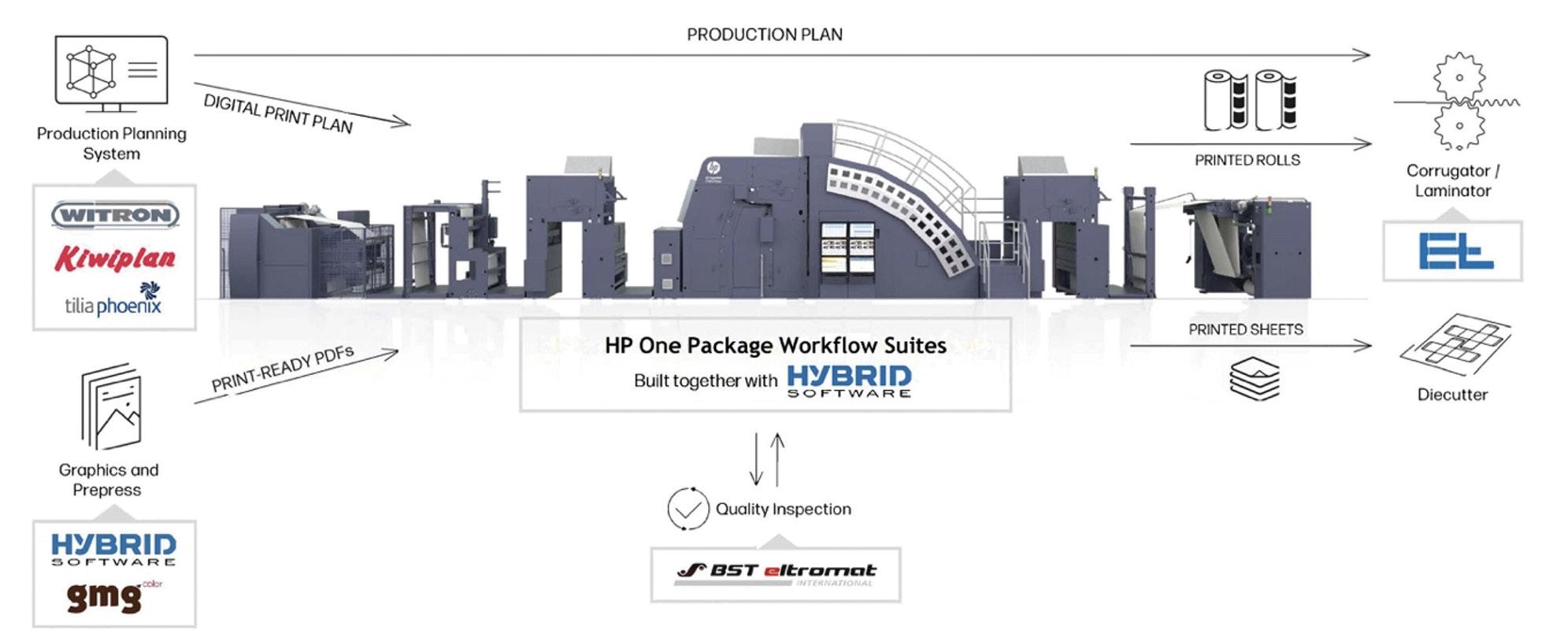 HP worked with Hybrid Software to create the HP One Package Preprint Workflow Suite, which optimizes the packaging print workflow. The HP One Package Preprint Production Module is software supplied with the press that enables HP webfed presses to be integrated with ERP systems, corrugator planning systems, prepress systems, etc. At the core is Hybrid Software’s Cloudflow rule based pipeline solution. This provides the ability to create an optimized corrugated workflow to achieve streamlined production. HP One Preprint and Postprint packages work with industry leading partner solutions that were carefully selected, vetted, and substantiated by HP. For example, HP One Package can add production marks that can be read by converting solutions such as sheeters, laminators, or corrugators ensuring that digital reels with multiple jobs can be converted efficiently with minimum waste. One Package also connects with inspection systems and reel editing systems to