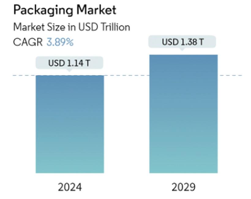Let’s start by looking at some statistics about the packaging industry and where the folding carton segment fits in. It should come as no surprise that the global packaging market continues its long growth trajectory. The current size of the entire packaging industry is USD 1.14 trillion and is expected to grow to USD 1.38 trillion over the next five years.