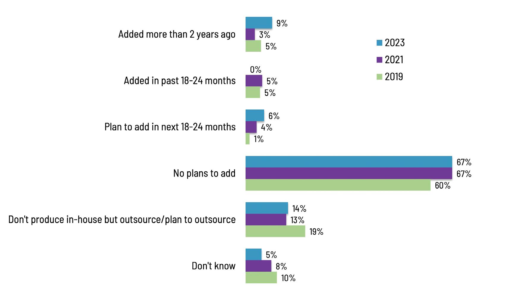 For corrugated packaging (see Figure 3), in 2023, 9% said they had added it more than two years ago, with another 6% planning to add it in the next 18–24 months. Twelve percent added it in the mid to late 2010s, and 10% added it in the mid 2010s. Two-thirds have no plans to add corrugated packaging capabilities.