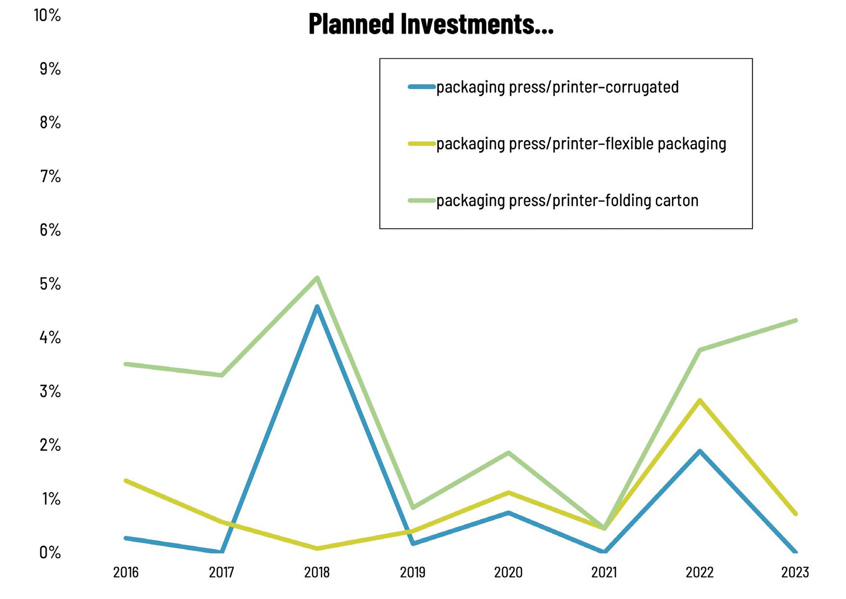 Figure 2: Planned investment in assorted packaging equipment. Source: WhatTheyThink Print Business Outlook surveys, 2016–2023.