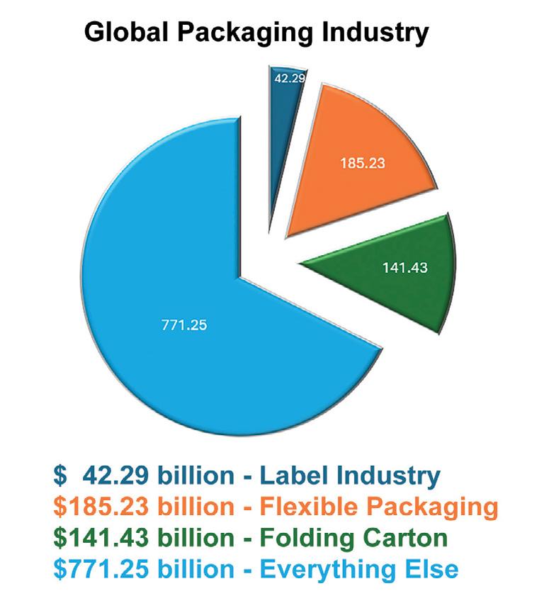 Folding carton is one of the primary segment types in the packaging industry, accounting for USD 141.43 billion, or a bit over 12.4% of the total industry. Folding carton, along with flexible package printing and labels together account for nearly 1/3, or 32.36%, of the total packaging industry (the “Everything Else” in this chart is just that; everything from metal, glass and plastic containers, to wrapping paper, bags and packing peanuts.)