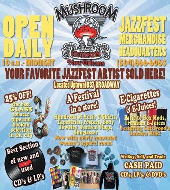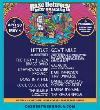 6 Jazz Fest II | Where Y'at Magazine May 2024 Publisher/Editor-in-Chief: Josh Danzig Creative Director: Robert Witkowski Executive Editor: Burke Bischoff Copy Editor: Donald Rickert Movie Editors: David Vicari, Fritz Esker Contributing Writers: Phil LaMancusa, Debbie Lindsey, Kim Ranjbar, Burke Bischoff, Julie Mitchell, Sabrina Stone, Kimmie Tubré, Emily Hingle, Celeste Turner, Joey Cirilo, Jeff Boudreaux, Cynthea Corfah, Brooke Adams, Frances Deese, Arielle Gonzales, Amy Kirk Duvoisin, Michelle Nicholson Cover: George Porter Jr. by Frenchy Director of Sales: Jim Sylve Photographers and Designers: Gus Escanelle, Kim Ranjbar, Emily Hingle, Robert Witkowski, Ashley Damron Interns: Lauren Walker, Eliana SarfatiMagill, Janay Major, Ireland Gross, Audrey Campisi, Gabriella Bonura Subscribe: Receive 1 year (14 issues) for $30. Subscribe today at WhereYat.com. Logo ©2024 All rights reserved Bruce Betzer, Legal Counsel: (504) 304-9952 Where Y’at Magazine 5500 Prytania St., #133 New Orleans, LA 70115 (504) 891-0144 info@whereyat.com WhereYat.com CLOCKWISE, FROM TOP: LAUREN WALKER; JIM PIETRYGA_WIKIMEDIA COMMONS; APAHFCOURTESY APAHF / JEREMY SMITH / FRENCH MARKET CORP.; LONGUE VUE HOUSE AND GARDENS; GUSTAVO ESCANELLE 40 20 42