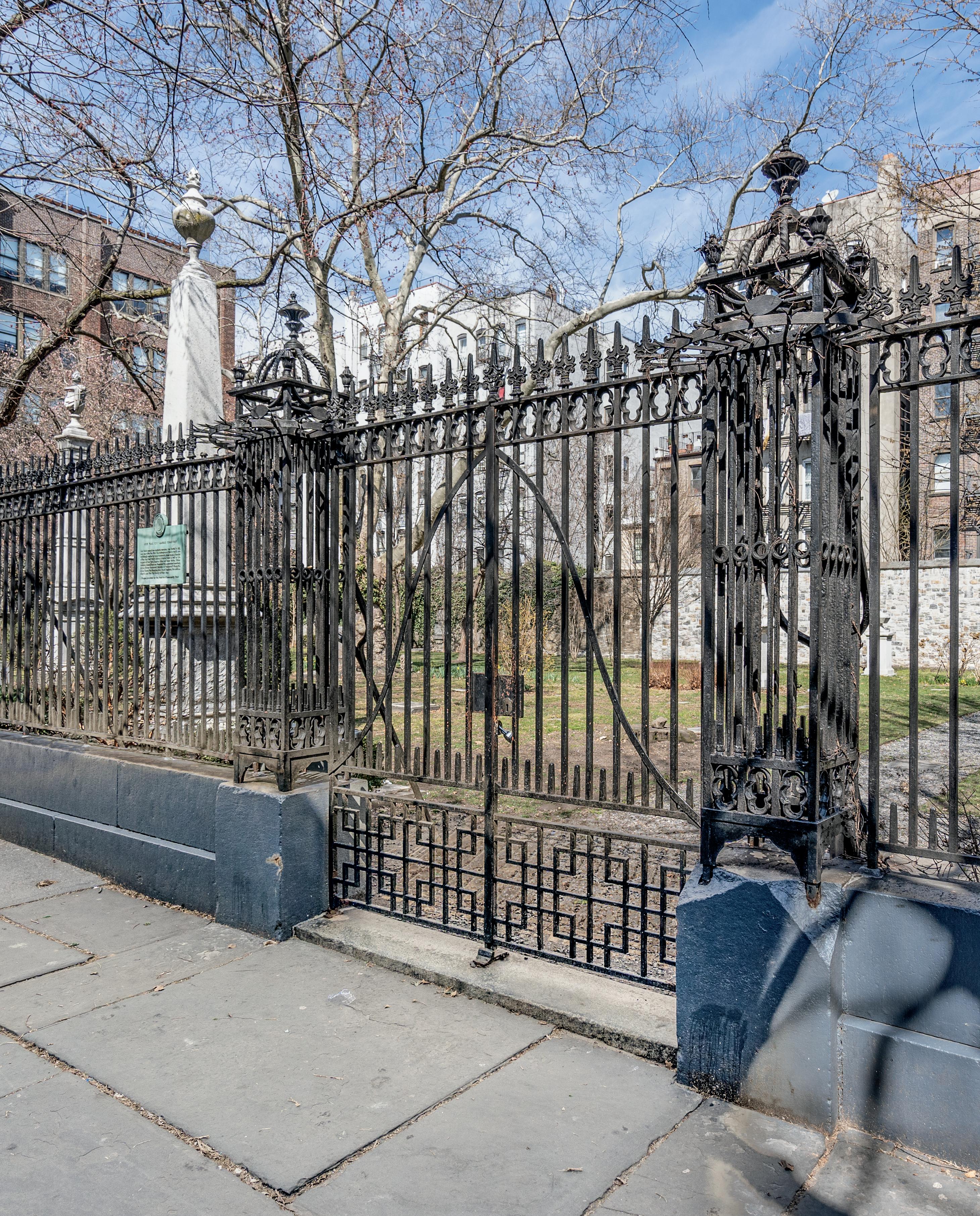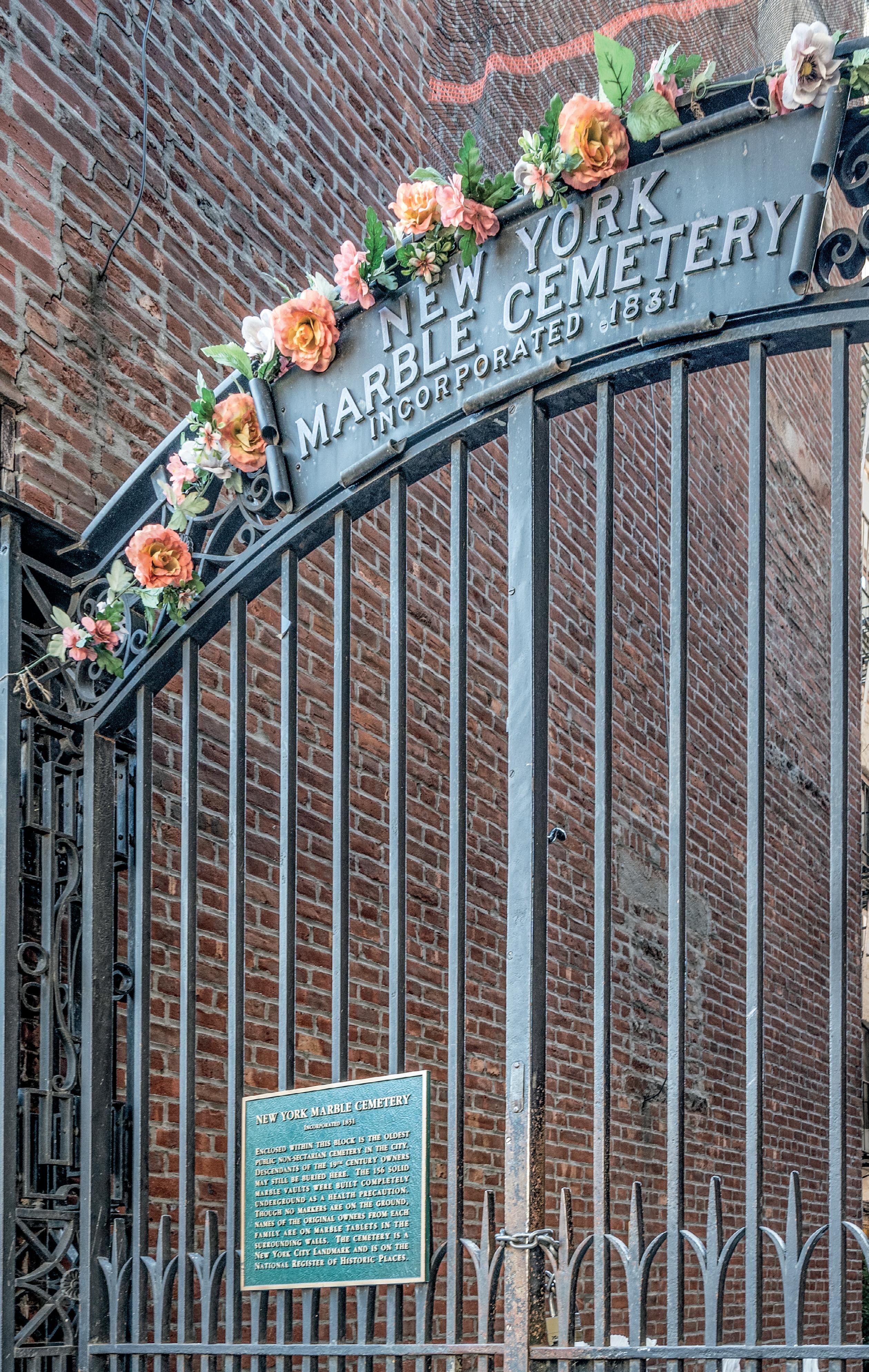 The gates to New York Marble Cemetery, where President Monroe was briefly interred in 1831, carry a historical marker identifying the site as the oldest public nonsectarian cemetery in New York.