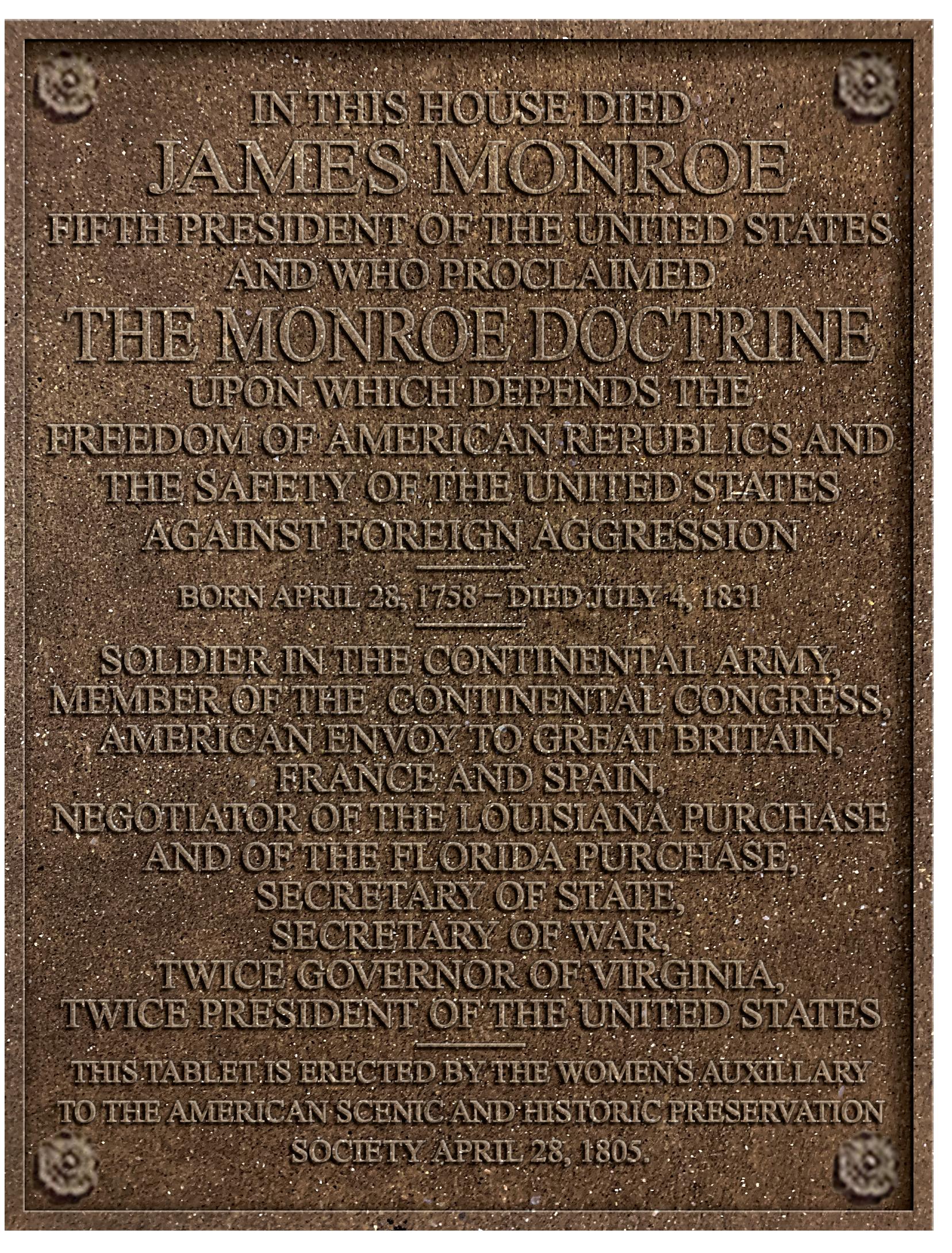 19. “News of the Week: Wednesday, November 18,” Christian Advocate, November 26, 1903, 1942 (46). A final coda came in 1903, when the remains of Monroe’s wife, Elizabeth Kortright Monroe, and one of his daughters, Maria Hester Monroe Gouverneur, were removed from Leesburg, Virginia, and buried at his side. Monroe’s other daughter, Eliza Monroe Hay, died in Paris, France, and is buried in that city’s Père Lachaise Cemetery.