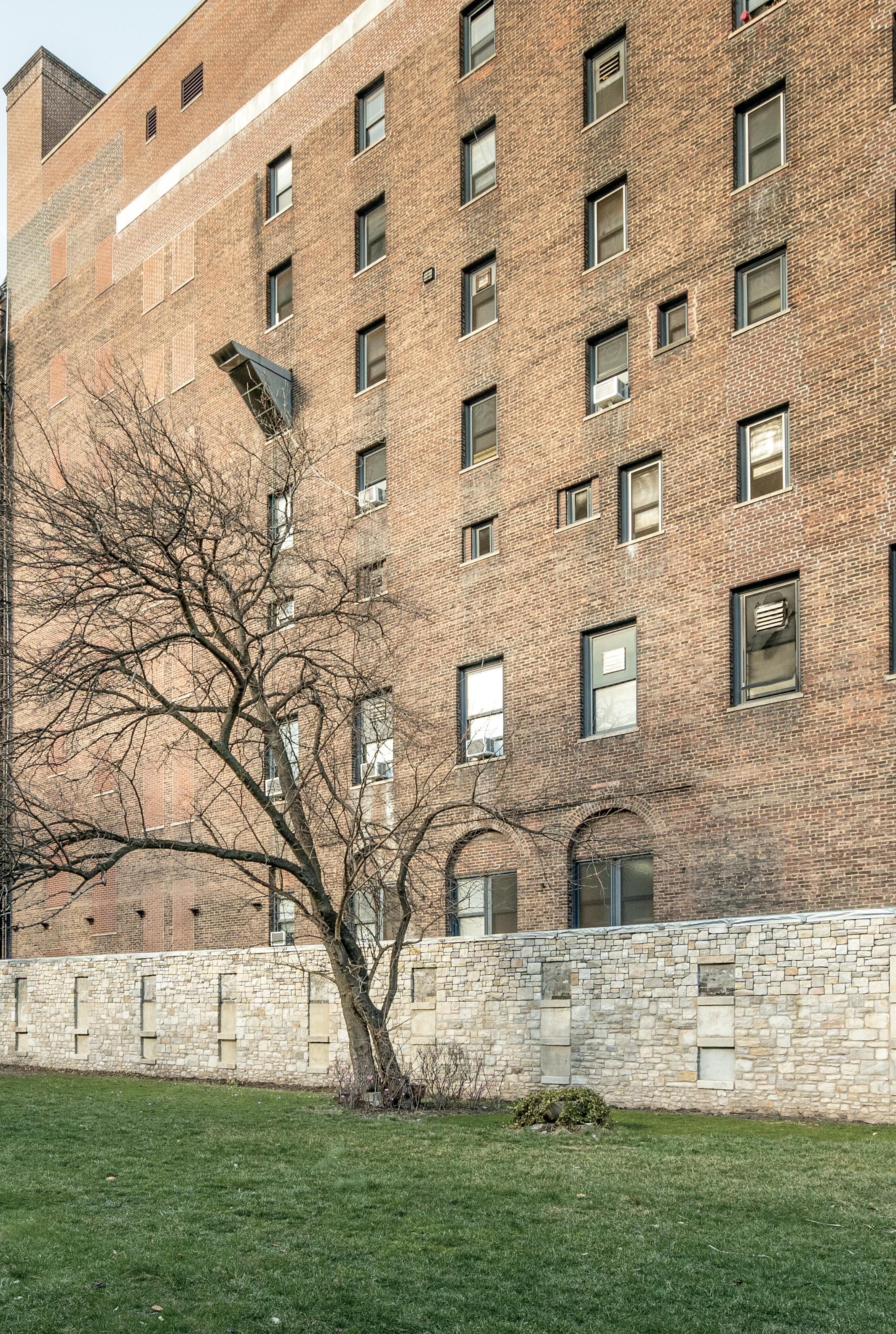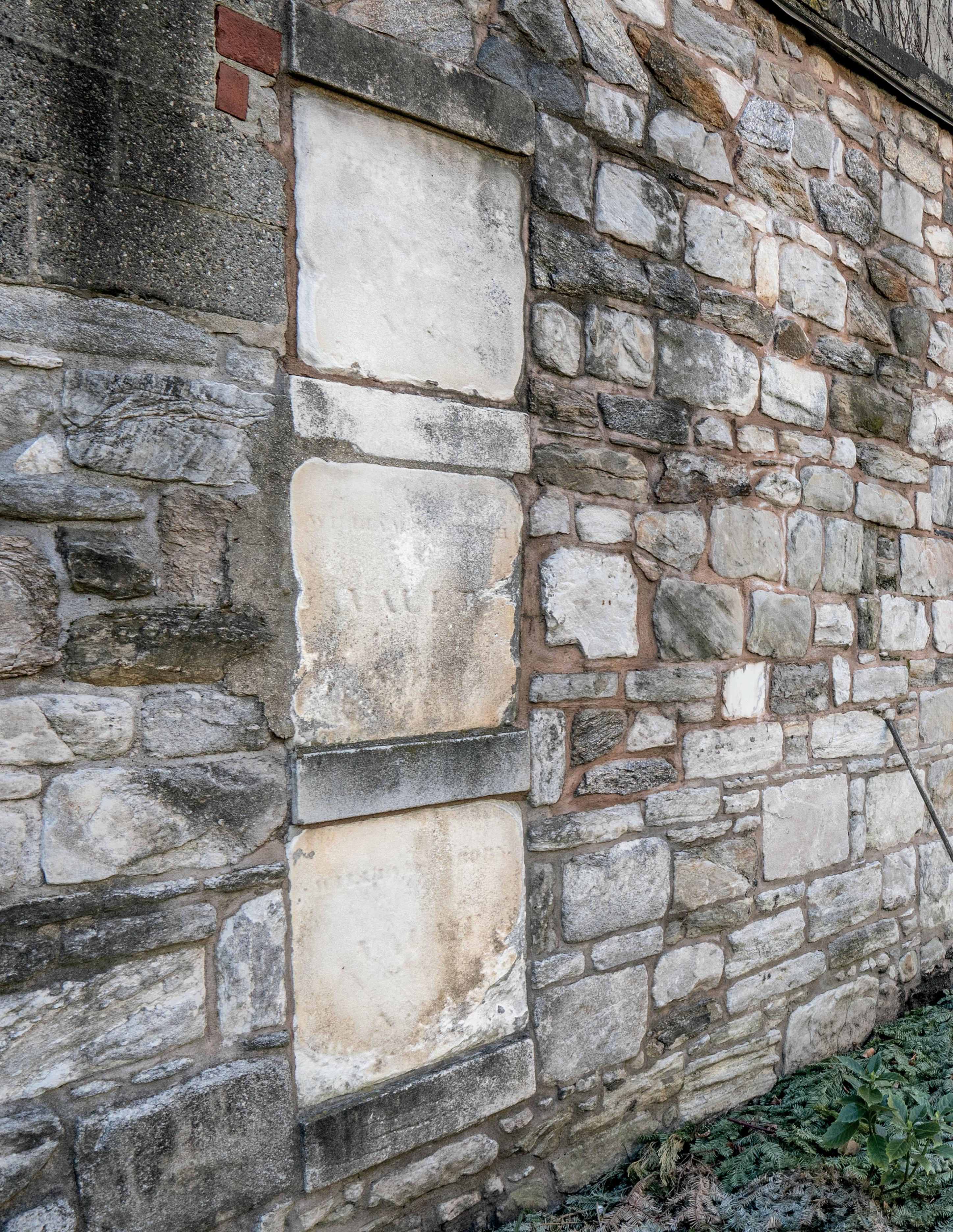 The original owners of the 156 underground marble vaults in New York Marble Cemetery are named on the marble markers set in the stone wall that surrounds the perimeter of the small cemetery. No monuments are allowed on the ground above the underground vaults. The cemetery, now surrounded by tall buildings, is seen here in 2023.