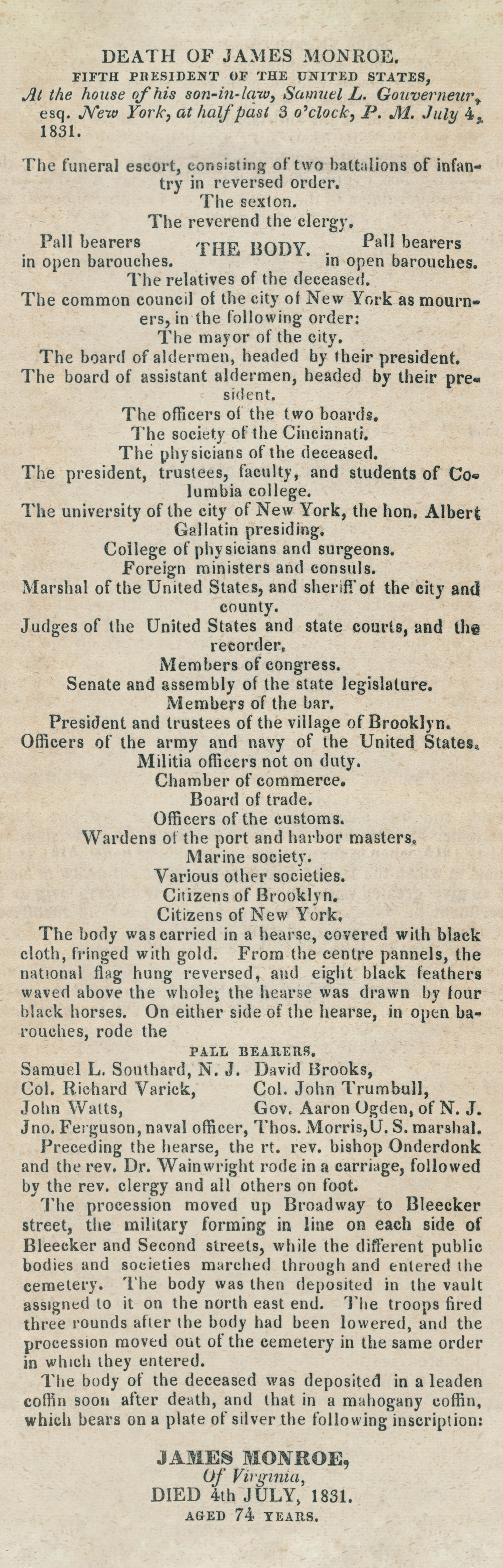 3. “Funeral of James Monroe,” Charleston (S.C.) Daily Courier, July 16, 1831, reprinting an article from the New York Mercantile Advertiser, July 8, 1831, 2.