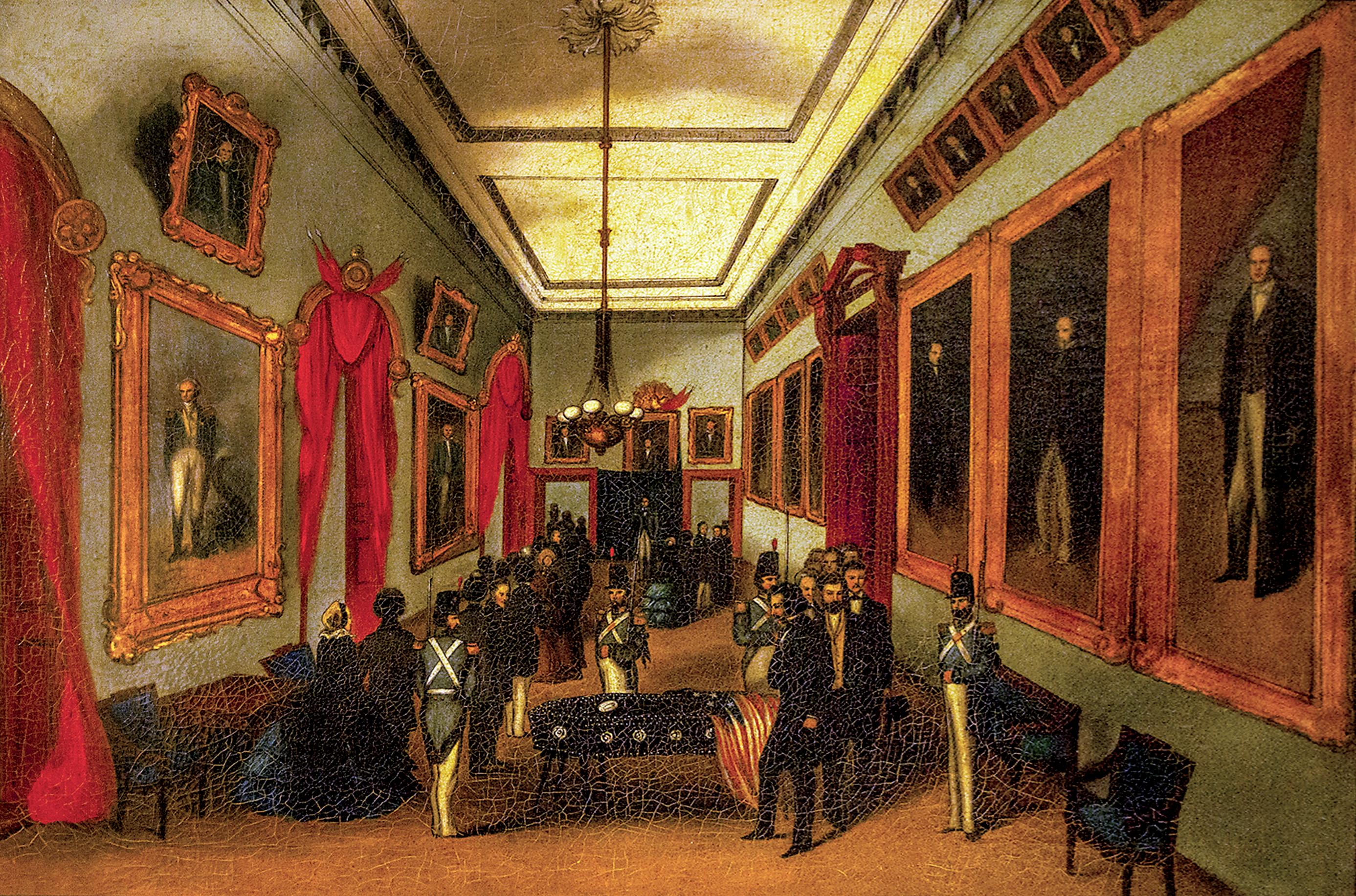 Monroe’s casket was moved from the cemetery to City Hall, where an estimated ten thousand people filed by to pay their respects to the fifth president of the United States before it was moved to the Jamestown to sail to Virginia. Monroe’s grandson, Samuel Gouverneur Jr., who was not at the event, commissioned this oil painting to include himself facing the foot of his grandfather’s coffin.