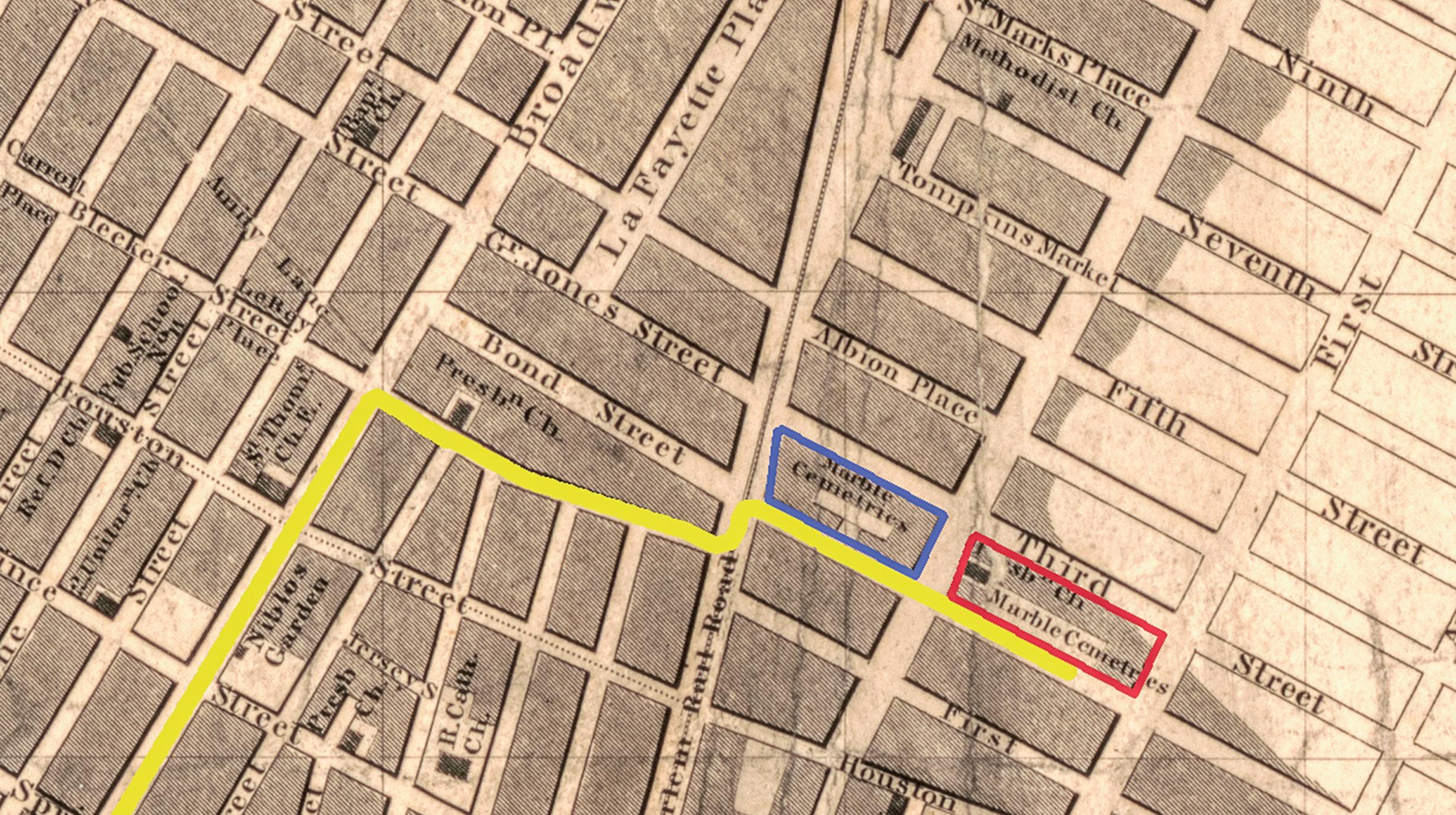 Two cemeteries on Second Avenue are seen on the route of the Monroe funeral procession (traced in yellow) on this 1833 map of Manhattan. From St. Paul’s Chapel, the procession moved north on Broadway, turned east on Bleeker Street and continued on Second Street. New York Marble Cemetery (outlined in blue) was likely a short-term resting place for Monroe’s remains. New York City Marble Cemetery (oulined in red) just one block farther east, would hold Monroe’s remains for twentyseven years.